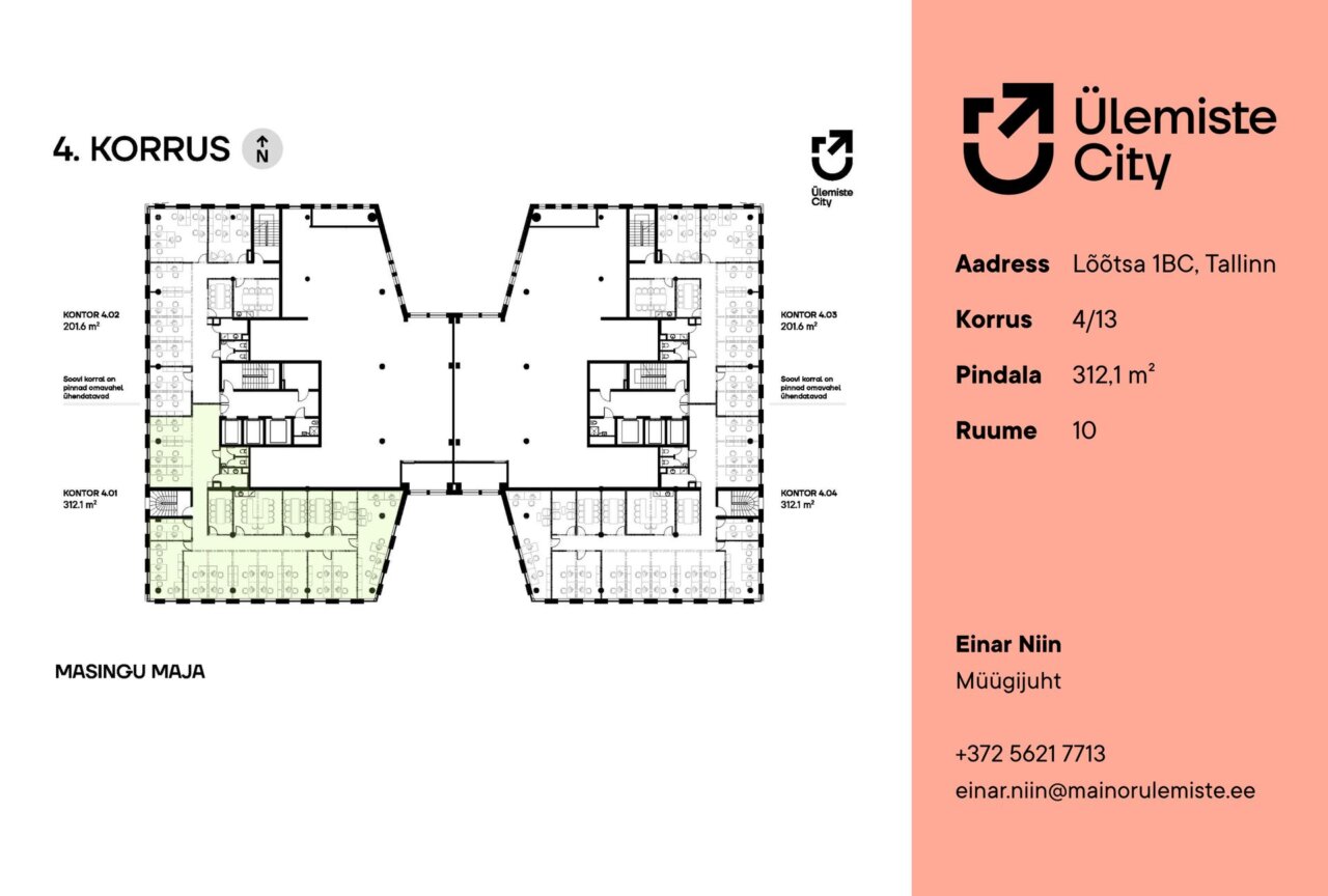Büroopind asub Masingu maja B-torni 4. korrusel, pakkudes eksklusiivseid ja inspireerivaid vaateid nii Ülemiste Cityle kui ka Ülemiste järvele. Suured aknad toovad ruumidesse rohkelt loomulikku valgust ning loovad kaasaegse ja motiveeriva töökeskkonna.