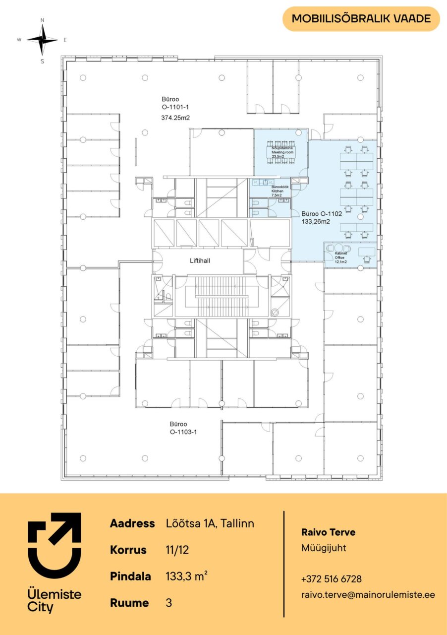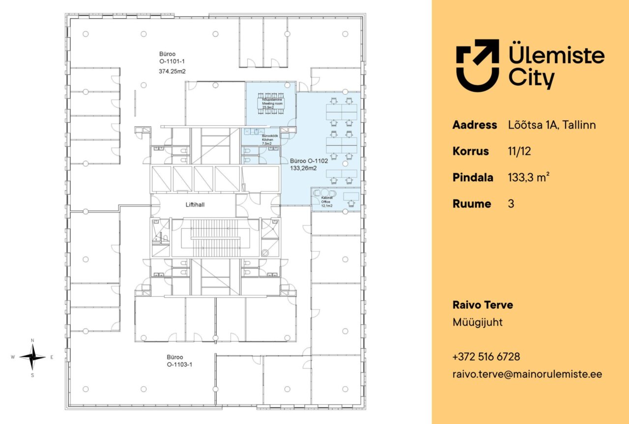 Baltikumi suurimas ärilinnakus Ülemiste Citys on üürile anda kaasaegne 133,30 m2 suurune büroopind Viktor Palmi maja 11. korrusel.