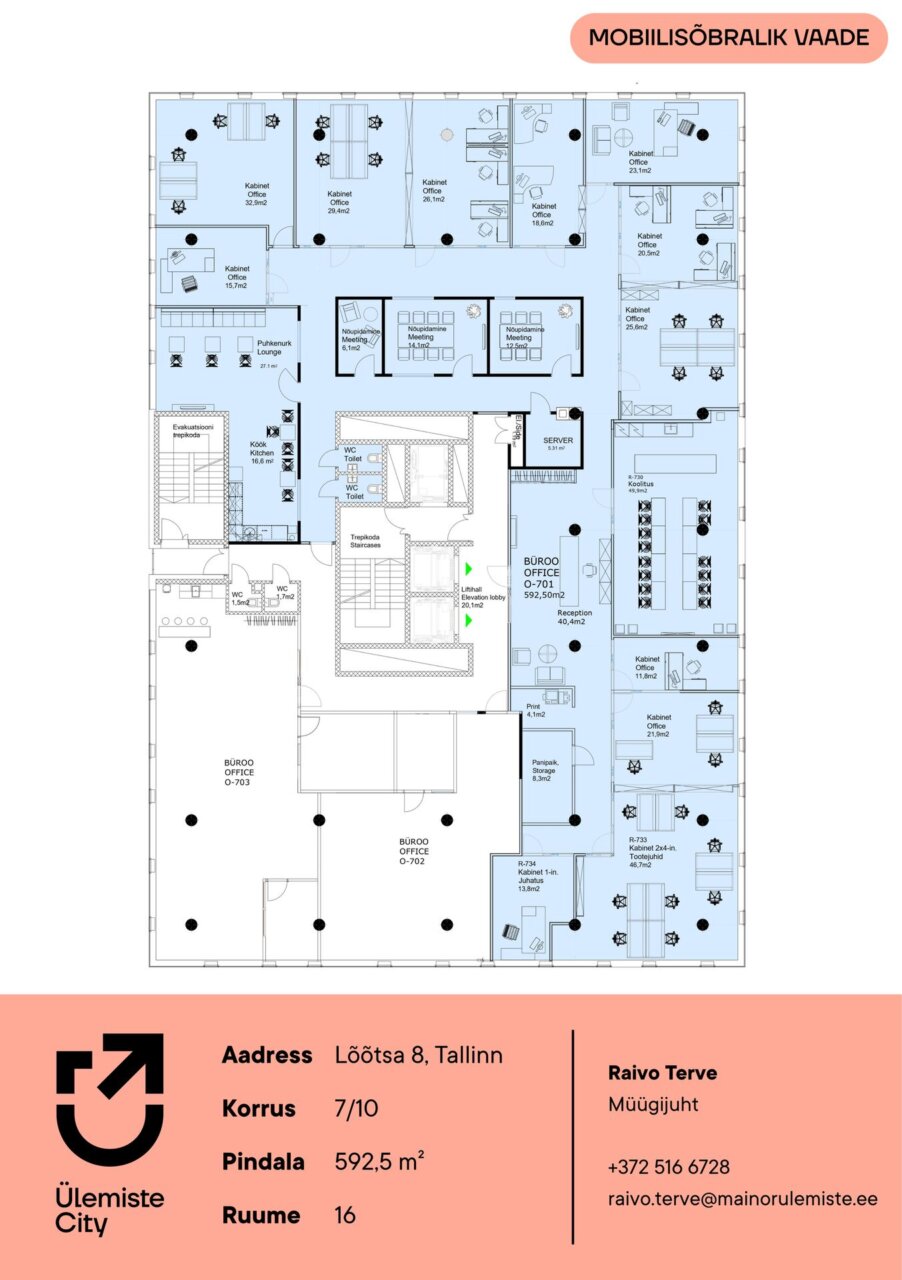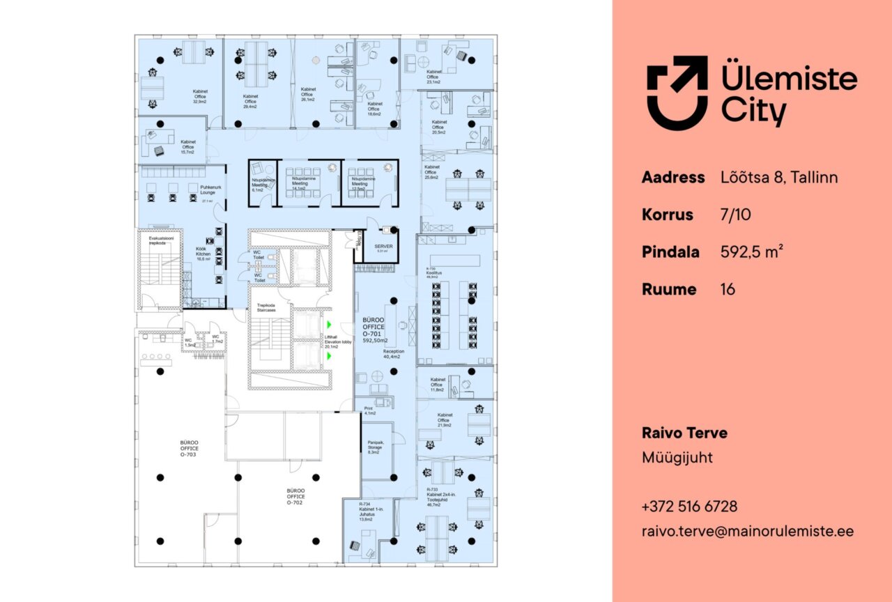 Üürile anda valgusküllane büroopind Lõõtsa 8 hoone 7.korrusel Ülemiste City linnakus. Kontoripinnal on olemas 12 kabinetti, kaks väiksemat koosolekuruumi, suurem koosolekuruum 12-16 inimesele, kõneboks, serveriruum, privaatsed tualetid ja möbleeritud köök koos tehnikaga. Büroopind on sobilik 50-60 töötajale. Võimalik on muuta ruumiplaneeringut ja siseviimistlust koostöös sisekujundajaga.