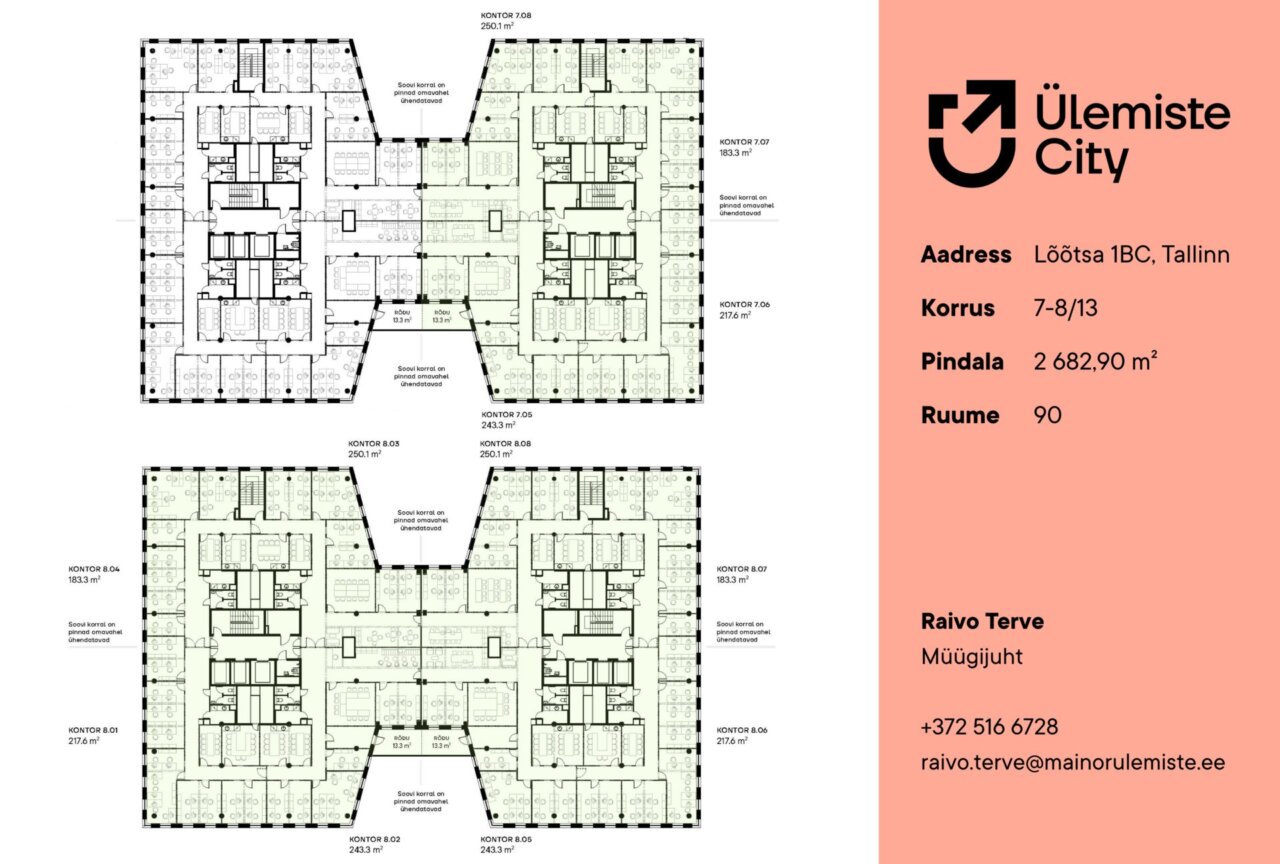 Üürile anda 1/2 7.korrusest ja terve 8. korrus, kokku suurusega 2 682,90 m², Masingu majas Ülemiste City südames. See esinduslik ja paindlik kontoripind on ideaalne suurematele ettevõtetele, kes vajavad avarat tööruumi, kus on võimalik luua erinevaid tööalasid – avatud kontori lahendus, koosolekuruumid, privaatse tööalade piirkonnad ning palju muud. Pind pakub suurepäraseid vaateid, rohkelt loomulikku valgust ja täiendavaid võimalusi ruumide kohandamiseks vastavalt üürniku vajadustele. See pind on ideaalne valik ambitsioonikale ettevõtele, kes otsib esinduslikku ja paindlikku töökeskkonda, kus igapäevane töö saab toimuda innovaatilises, energiatõhusas ja dünaamilises keskkonnas.