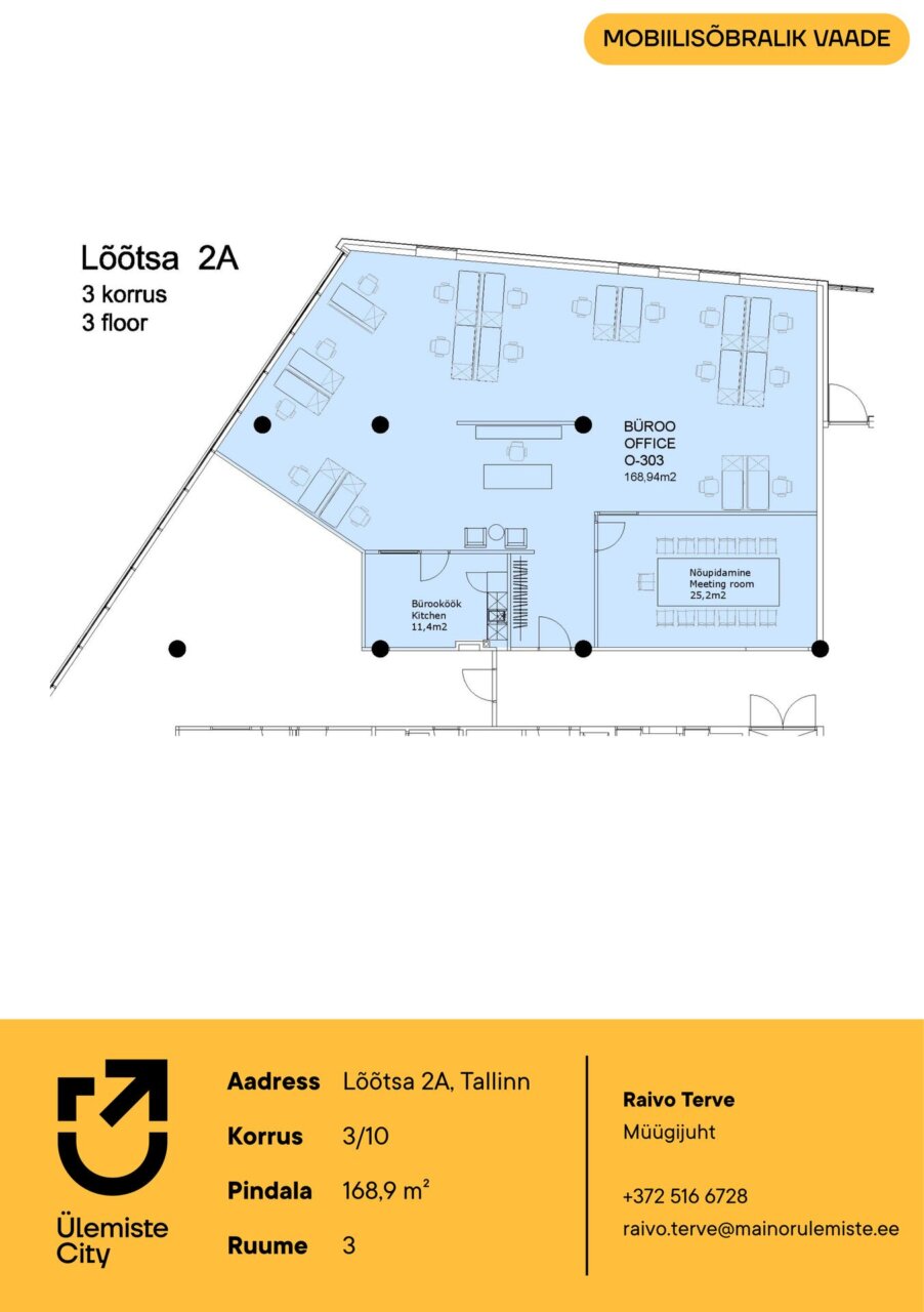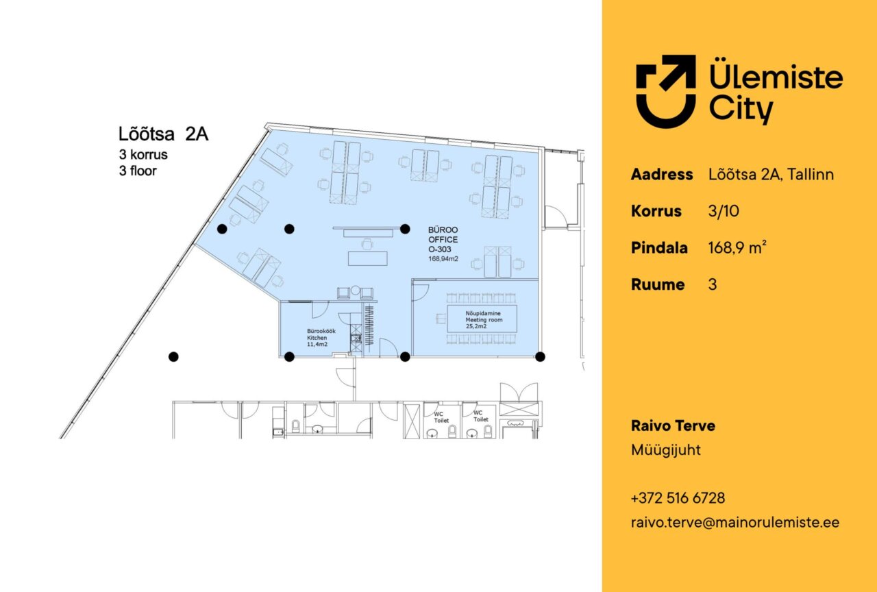 Üürile anda valgusküllane kontoripind Lõõtsa 2A hoone 3. korrusel. Kontoripinnal on üks suurem koosolekuruum, köök koos köögimööbli ja -tehnikaga ning avar avatud kontori osa, mis mahutab 15-18 töökohta. Büroo akendest avaneb avar vaade rajatavale Rail Baltica terminalile.