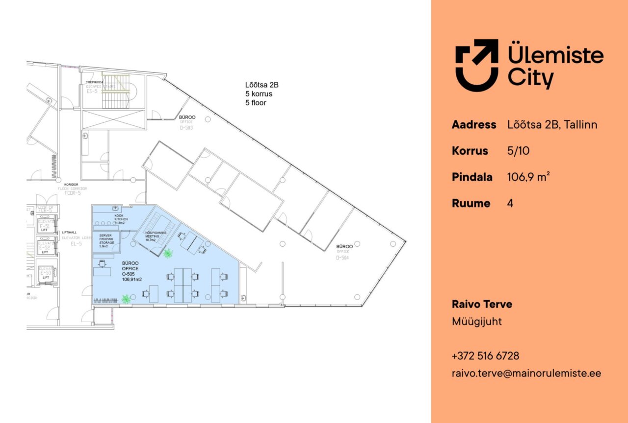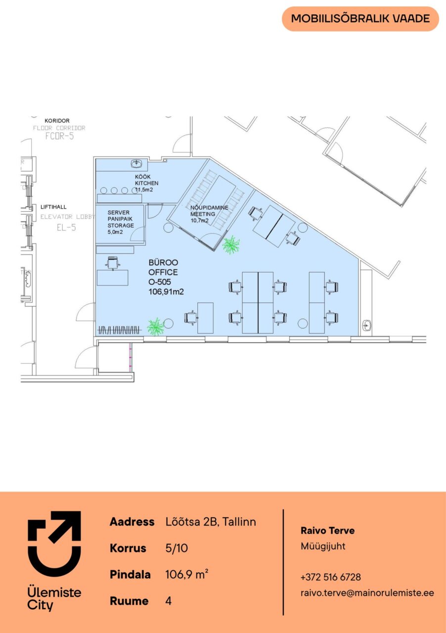 Anda üürile mõnusalt valgusküllane büroopind, mis asub Puusepa B hoone 5. korrusel. Pinna avatud tööala pakub võimalust ühisteks koosolekuteks kui loovaks tööks. Eraldatud köögunurk on varustatud kõige kontorieluks vajalikuga. Lisaks on büroos olemas oma nõupidamisteruum, mis loob privaatsust ja fookust nõudvateks vestlusteks.