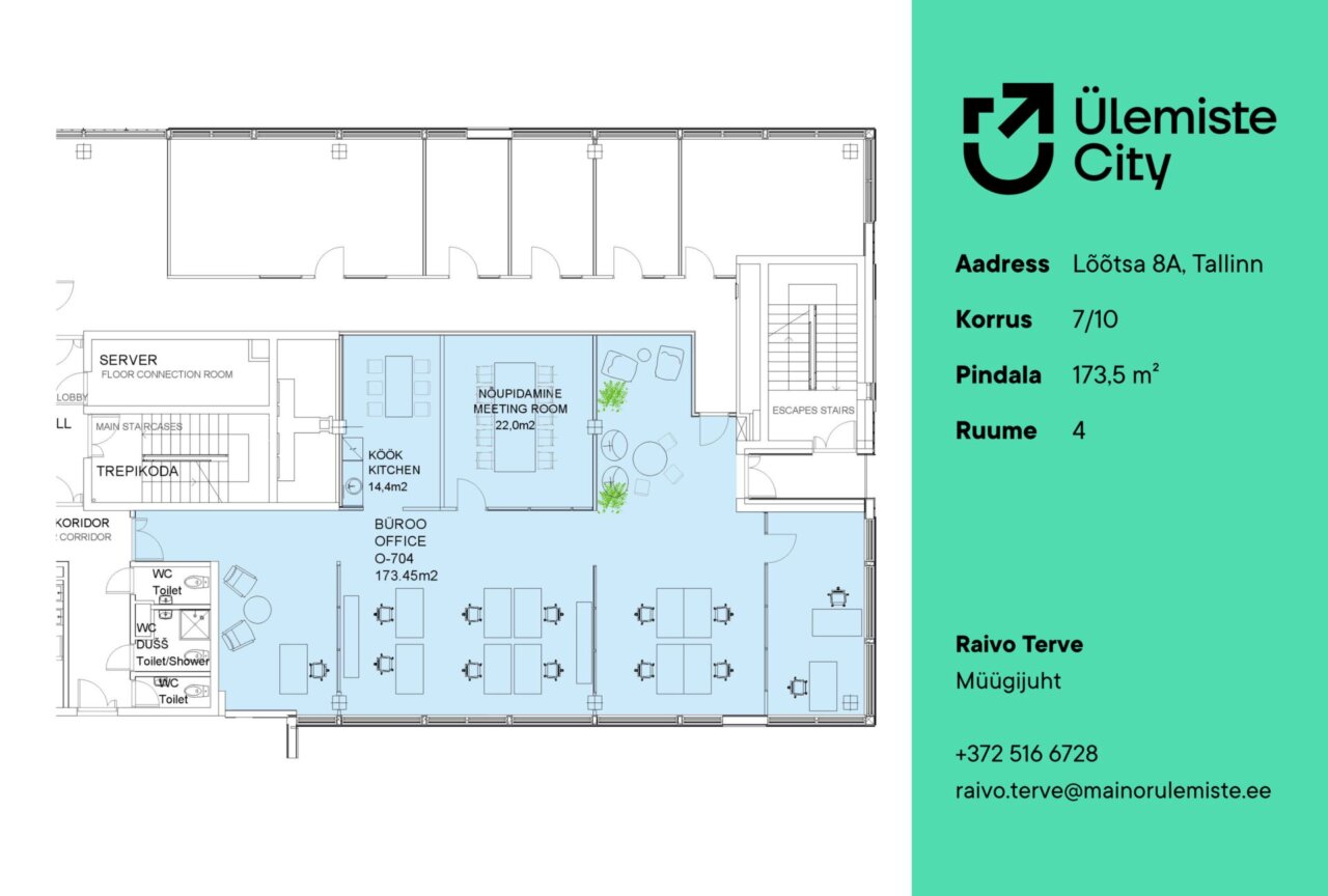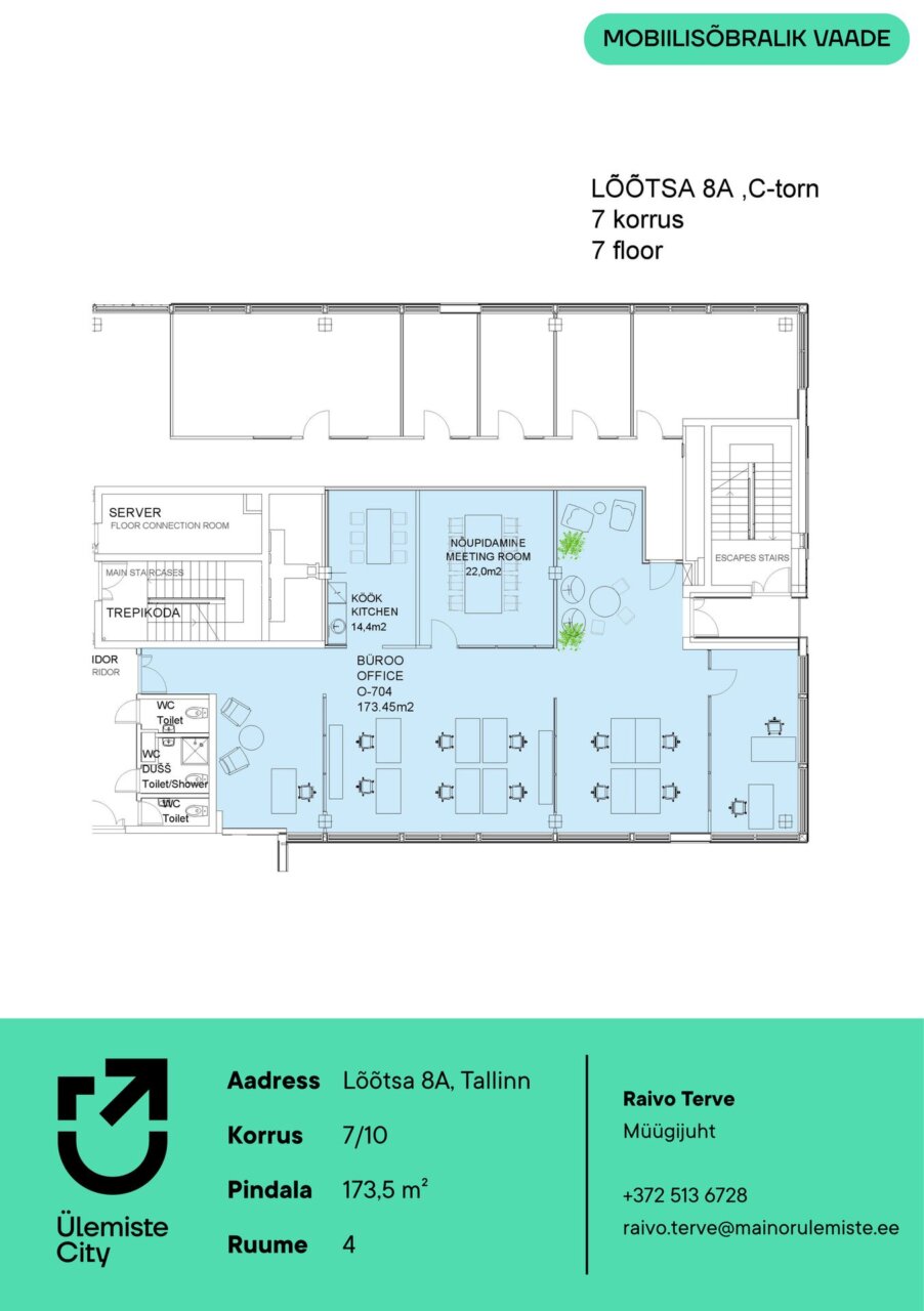 Üürile anda pargivaatega büroopind Lõõtsa 8a C-torni 7.korrusel. Kontoris eraldi puhkenurk koos köögimööbliga (nõudepesumasin, külmik, mikrolaineahi), eraldi suurem nõupidamisteruum, üks kabinet ja tsoneeritud avatud ala (eraldatud klaasvaheseintega). Nurgakabinetist avaneb avar vaade Ülemiste City pargialale. Võimalik muuta ruumiplaneeringut ja siseviimistlust koostöös sisekujundajaga. Võimalik väga kergesti ja tolmuvabalt lisada/maha võtta vaheseinu, lisada kabinette tehases eelviimistletud moodulseintega.