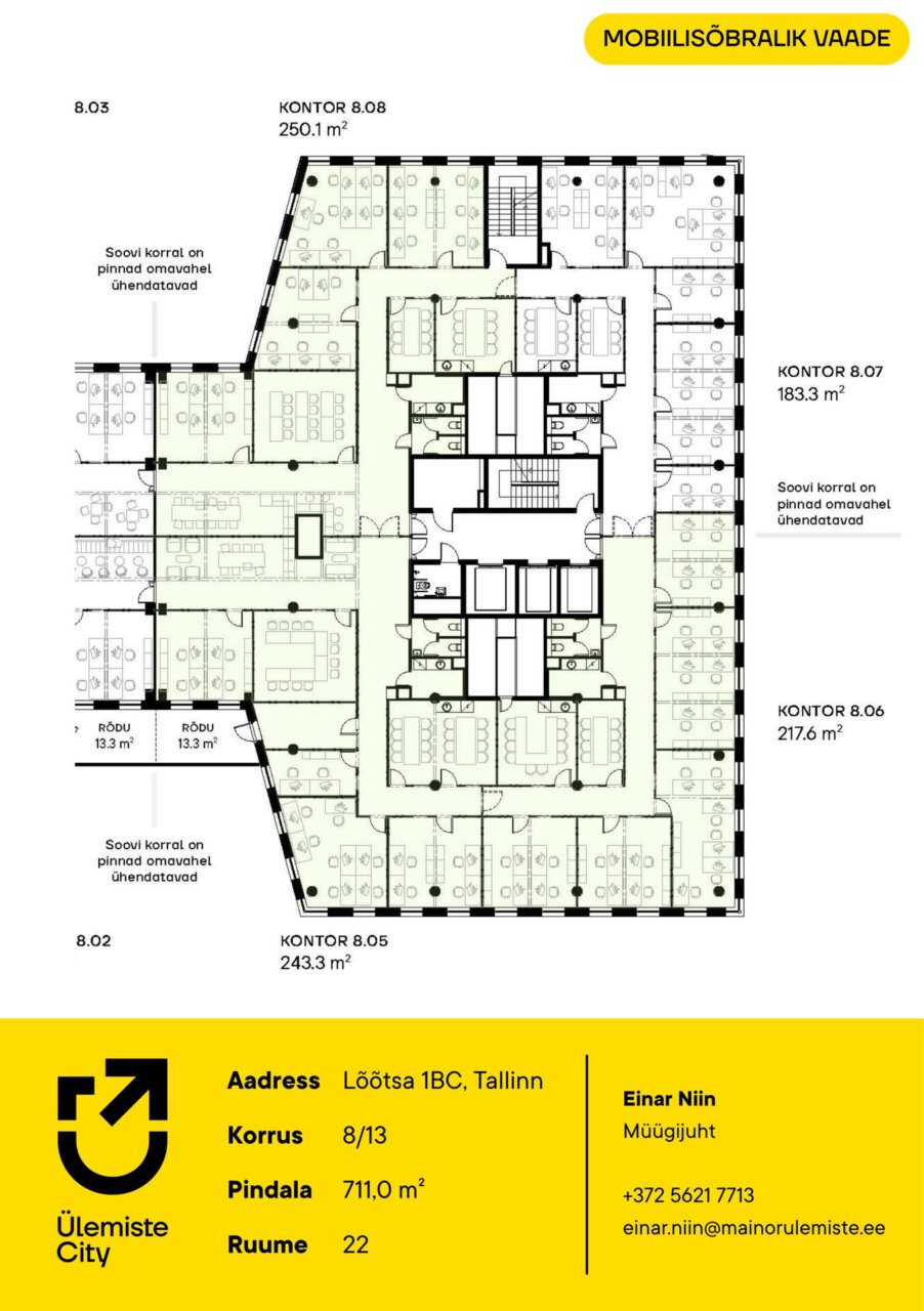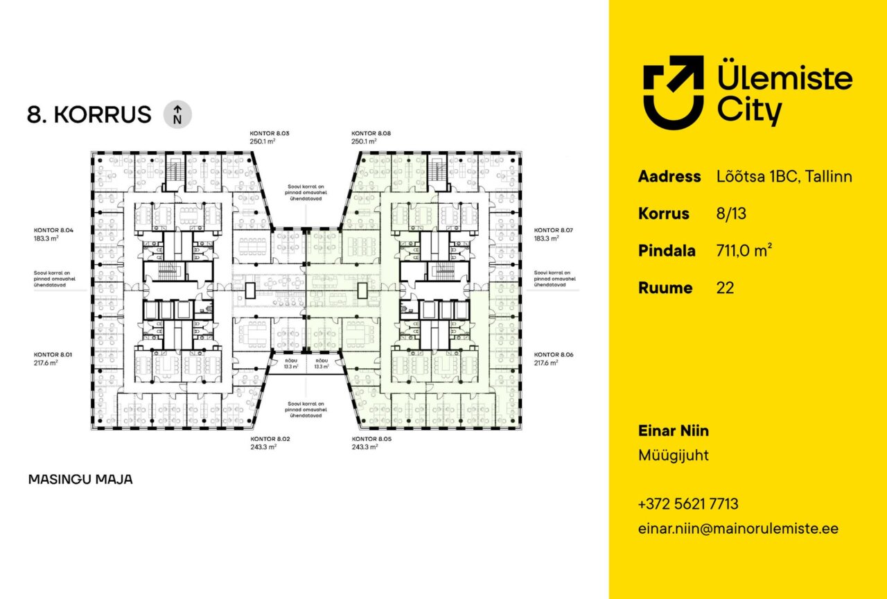 Üürile anda kõrgel 8. korrusel paiknevad kvaliteetsed ja mitmekülgsed büroopinnad Ülemiste City Masingu maja C-tornis. Pinnale lisavab väärtust privaatne rõdu suurusega 13,30 m², mis pakuvad vaadet linnakule ja loovad võimaluse puhkehetkedeks värskes õhus. Kõik ruumid on valgusküllased, varustatud kaasaegsete tehnosüsteemidega ning loodud pakkuma ergonoomilist ja inspireerivat töökeskkonda. Planeering on paindlik ja võimaldab nii avatud kontori kui ka eraldi kabinettide lahendust. Büroopindade viimistlus ja siselahendused valmivad koostöös üürnikuga, arvestades konkreetseid vajadusi ja brändi isikupära. Tegemist on ideaalse valikuga ettevõttele, kes otsib esinduslikku, energiatõhusat ja tulevikukindlat ärikeskkonda Tallinna kõige arenevas linnakus.